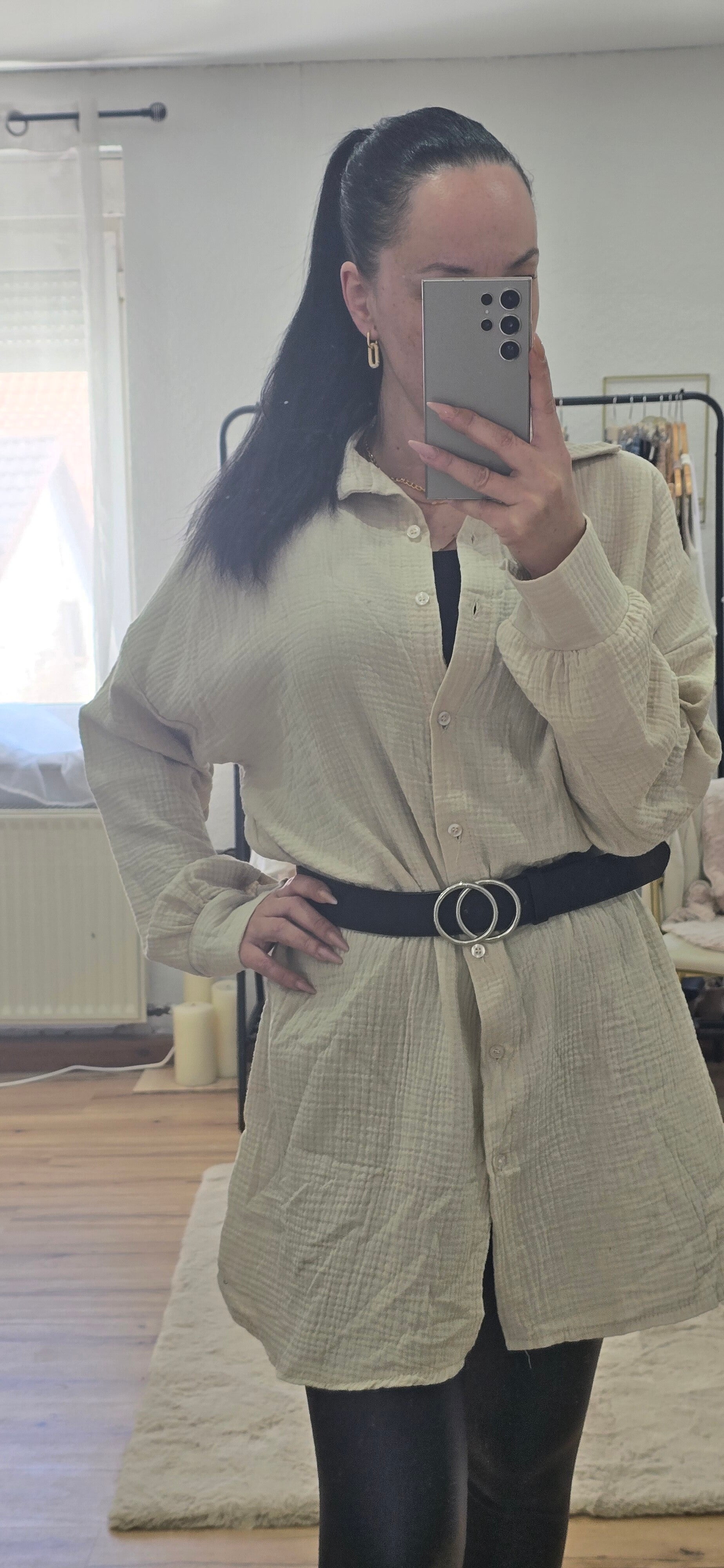 Diese wunderschöne lange Musselin-Bluse in beige ist ein echter Allrounder! Mit einem Gürtel verwandelst du sie im Handumdrehen in ein stylisches Blusenkleid.