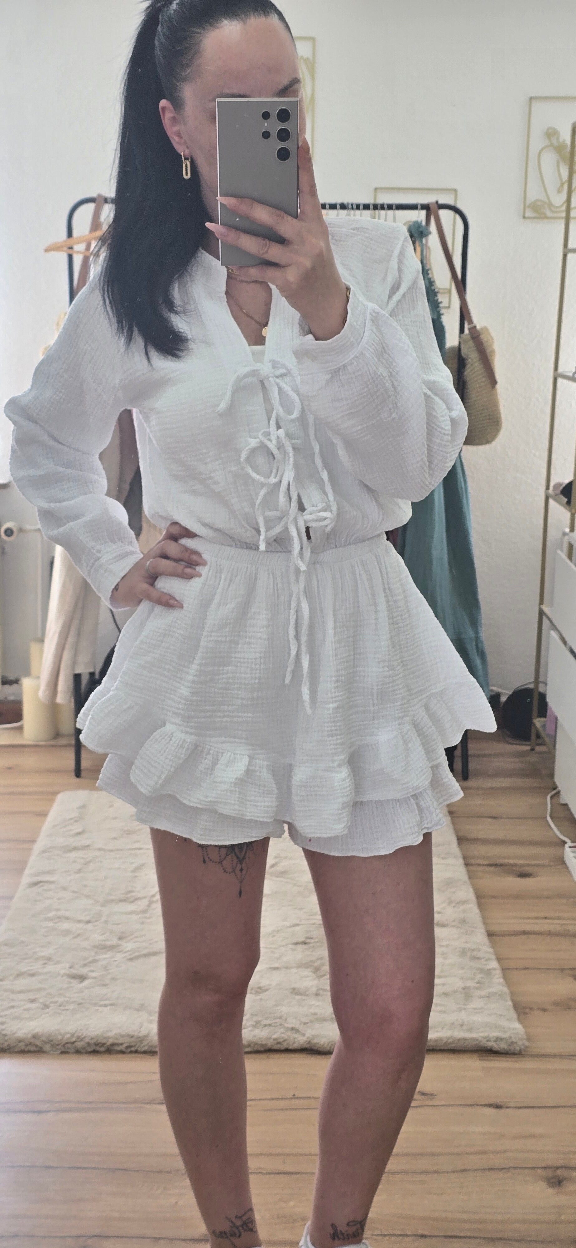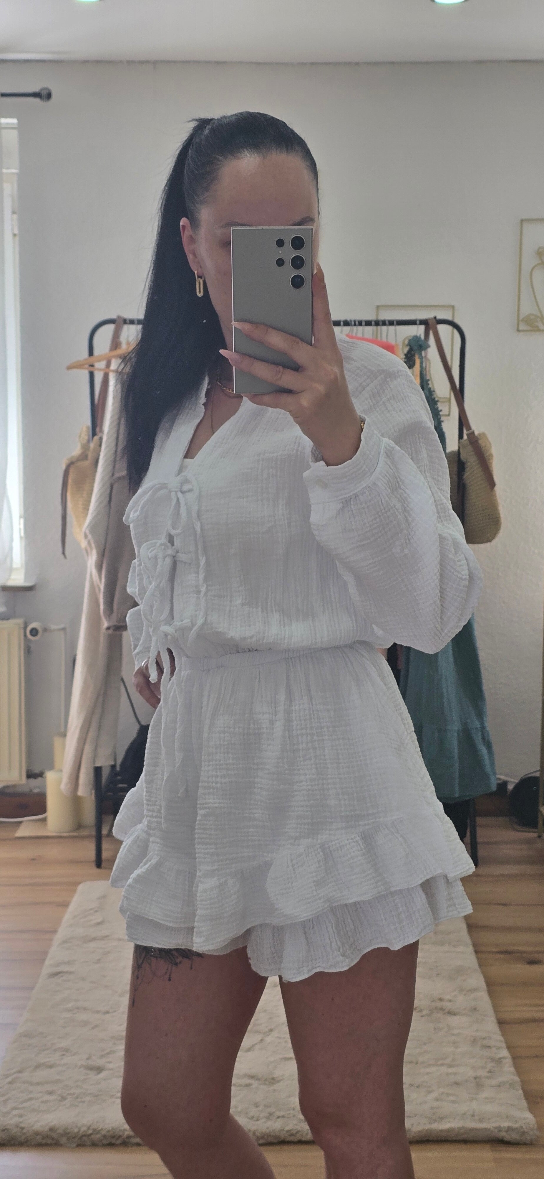 Kurzer Overall mit Bändern und Rüschen aus Baumwollgaze -WEIß-